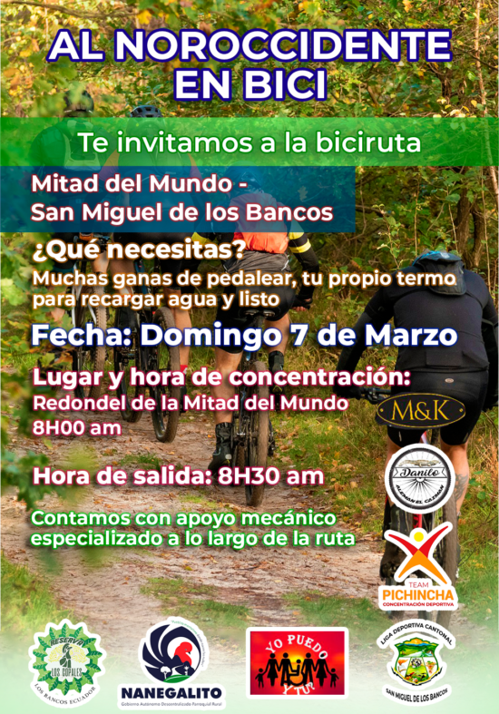 La Concentración Deportiva de Pichincha te invita este 7 de marzo a la Biciruta que parte desde la Mitad del Mundo hasta San Miguel de los Bancos, la hora de concentración es a las 08H00 en el redondel de la Mitad del Mundo.