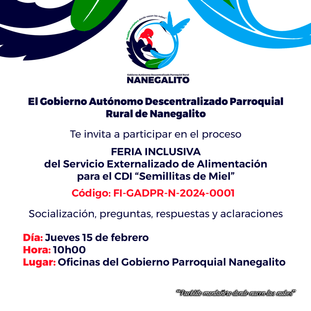 El Gobierno Parroquial Nanegalito te invita a participar en el proceso de FERIA INCLUSIVA del Servicio Externalizado de Alimentacion. Socializacion,